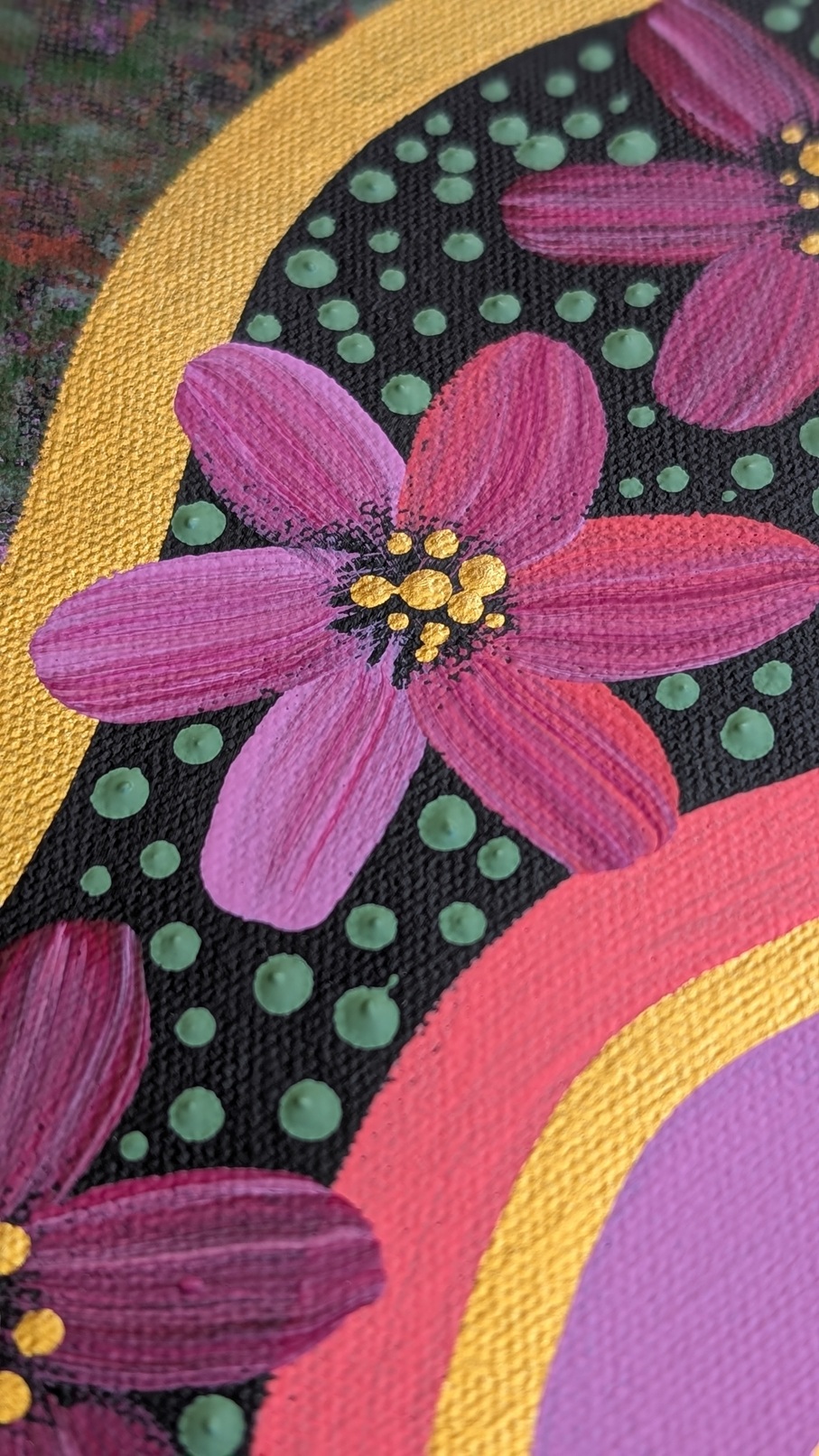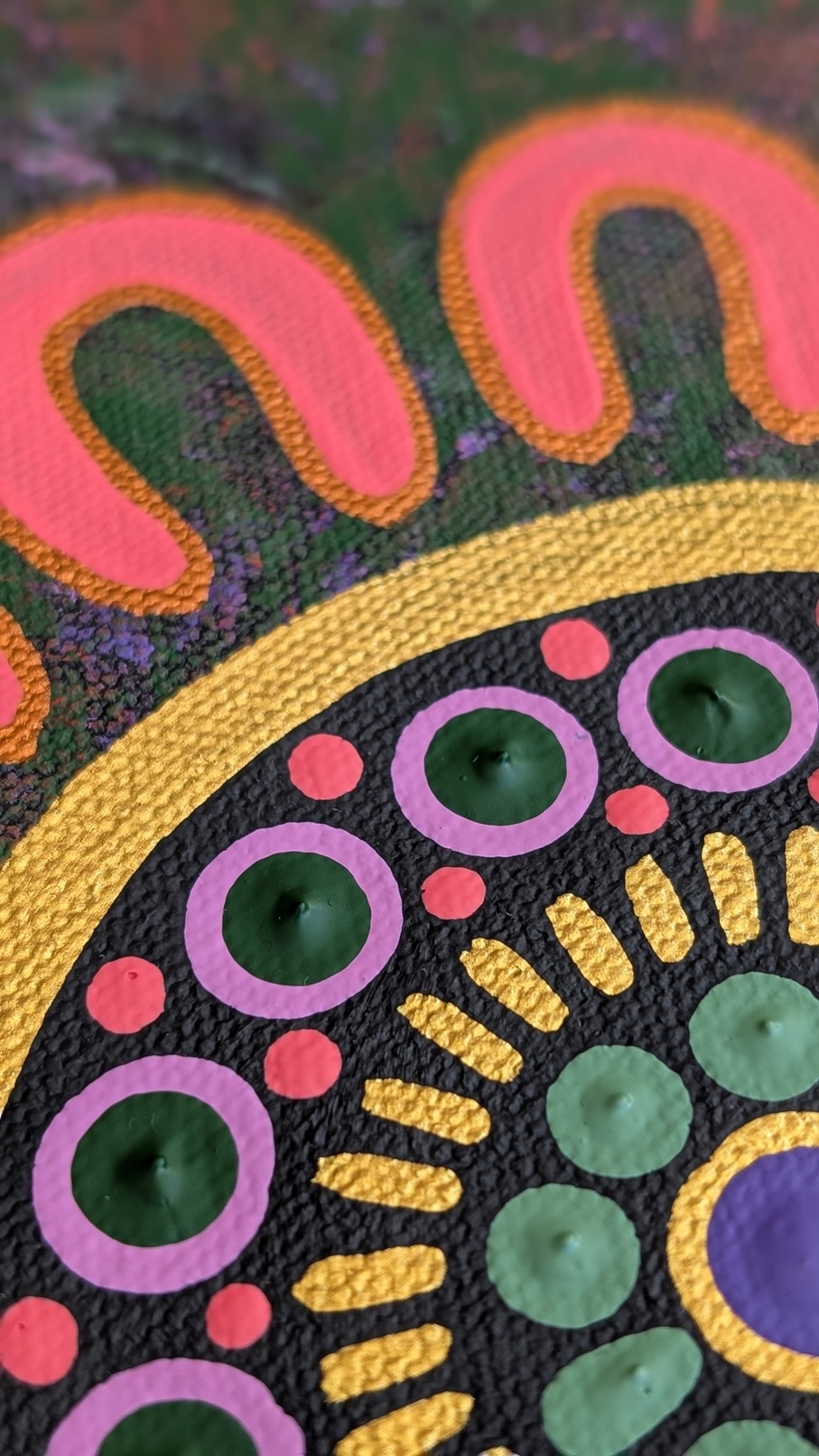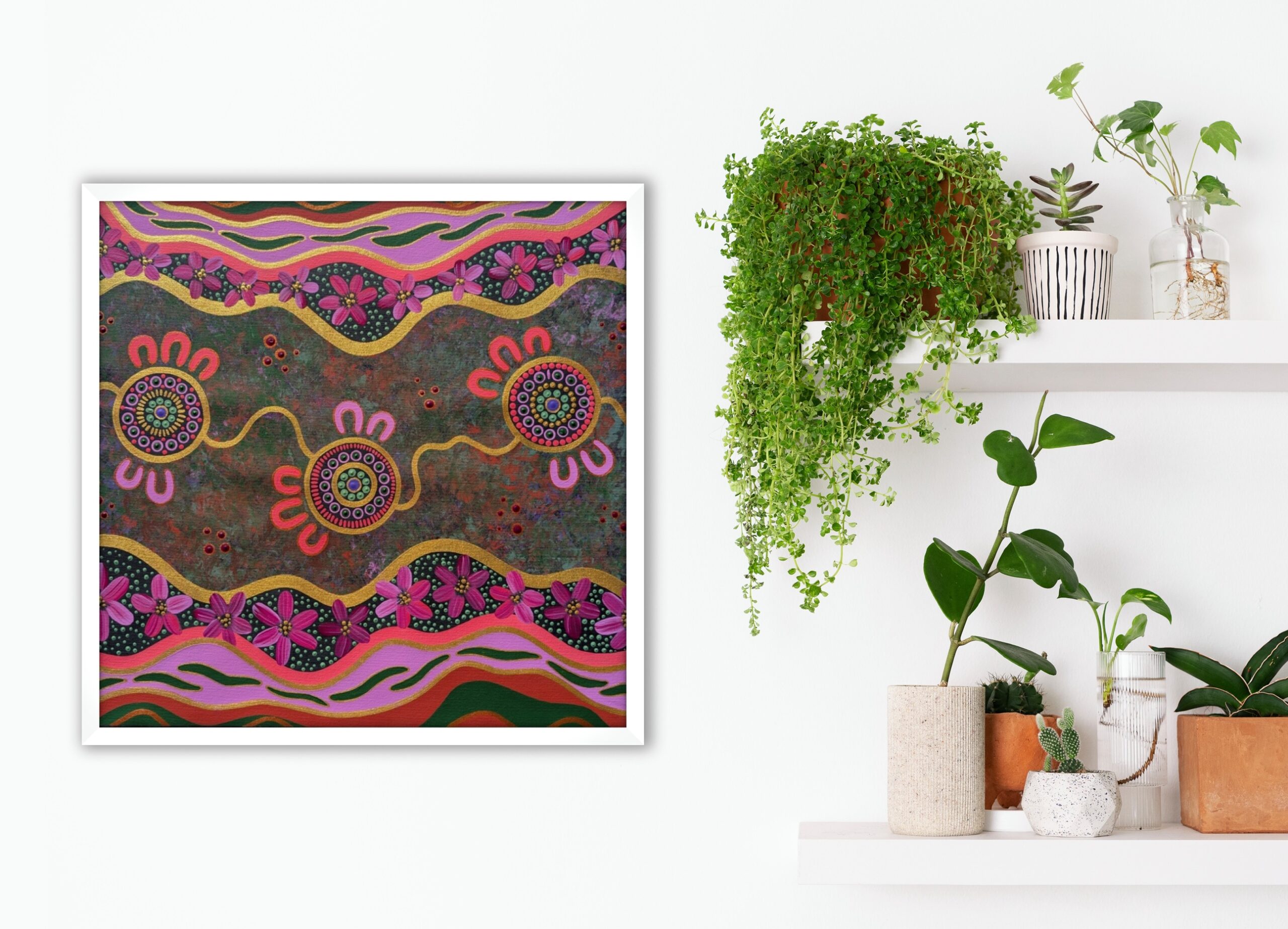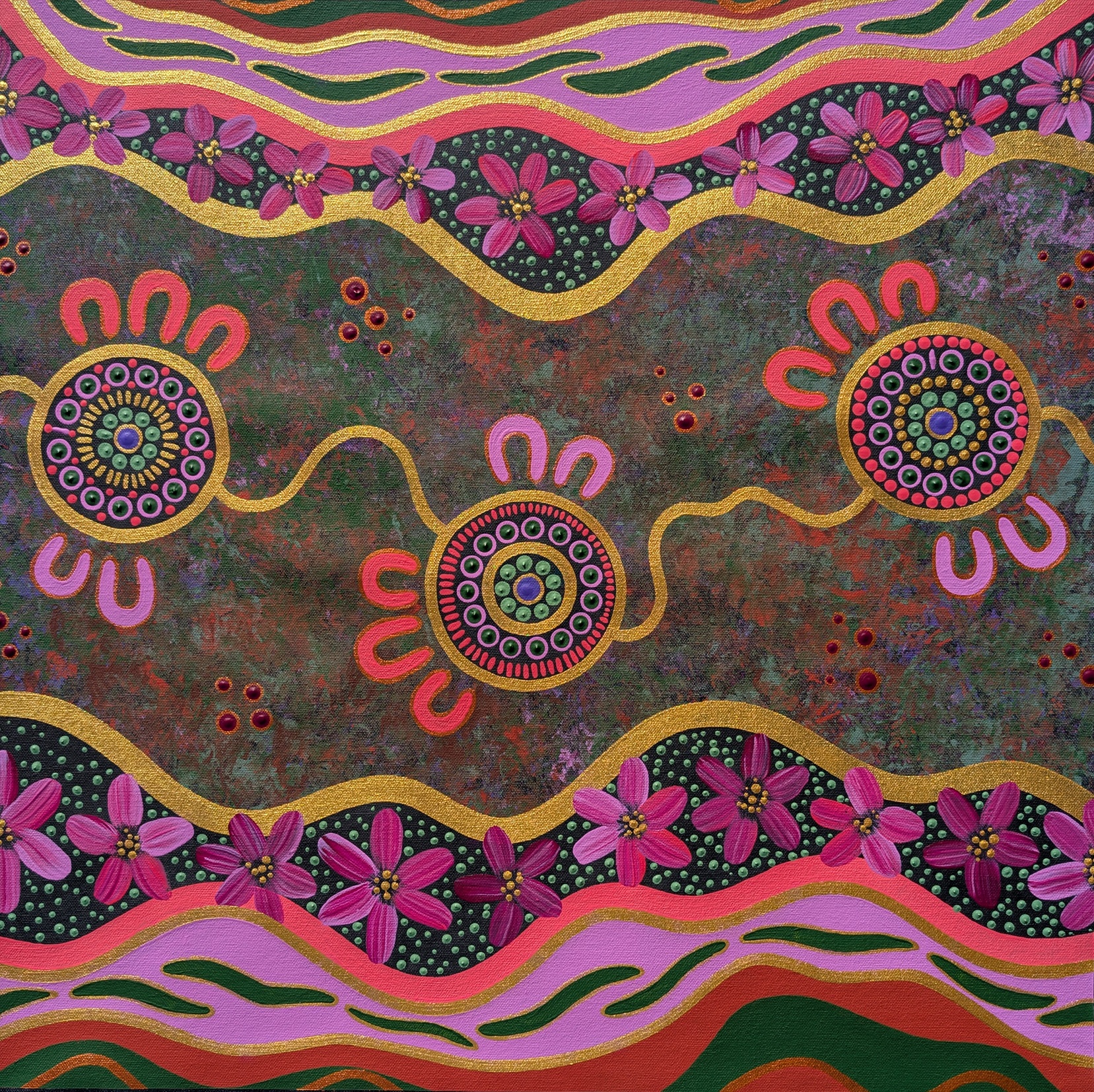 Medicine leaves represent healing and the passing down of knowledge. Deep greens symbolise flourishing Country, bright pinks and purples symbolise new life, seasonal change and joy while warm earth tones represent the vibrance and energy of the land and metallic golds represent the journeys of our ancestors.