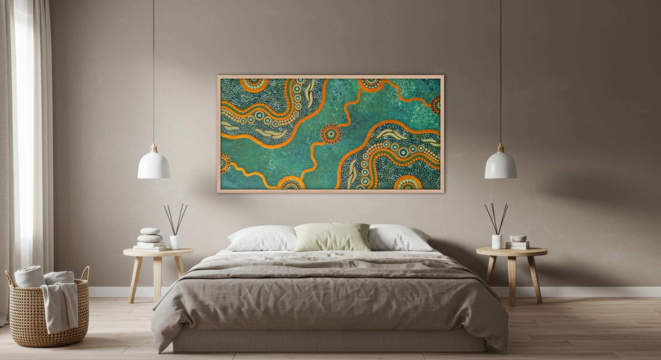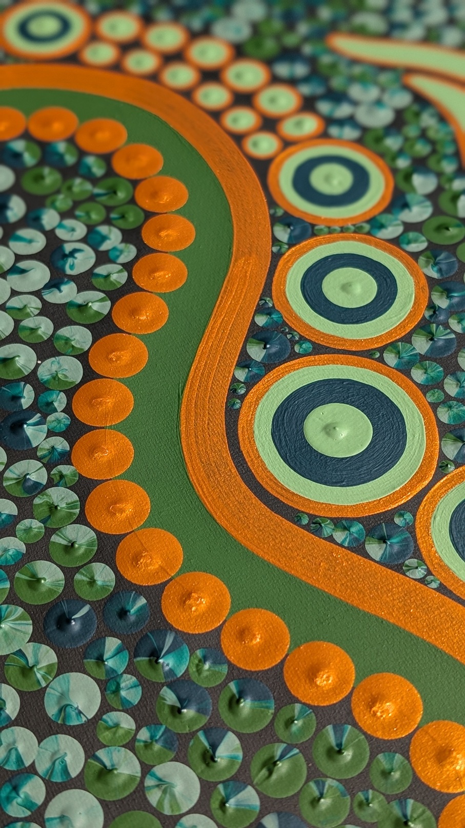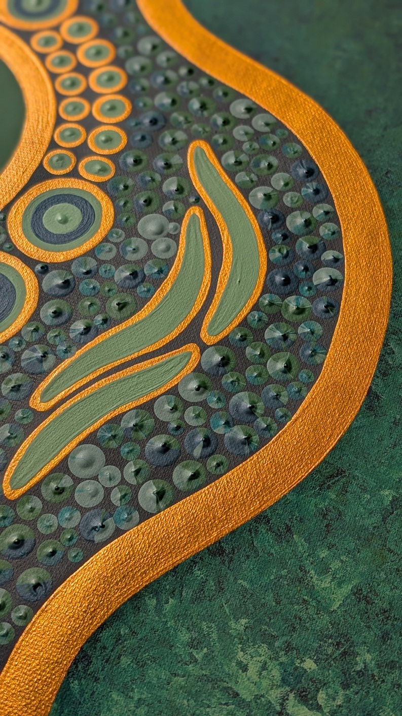 Golden journey lines represent morning light and connect symbols of campfires through the bush. Medicine leaves represent protection while on another Country and blended dots represent generations walking, gathering and caring for the land.