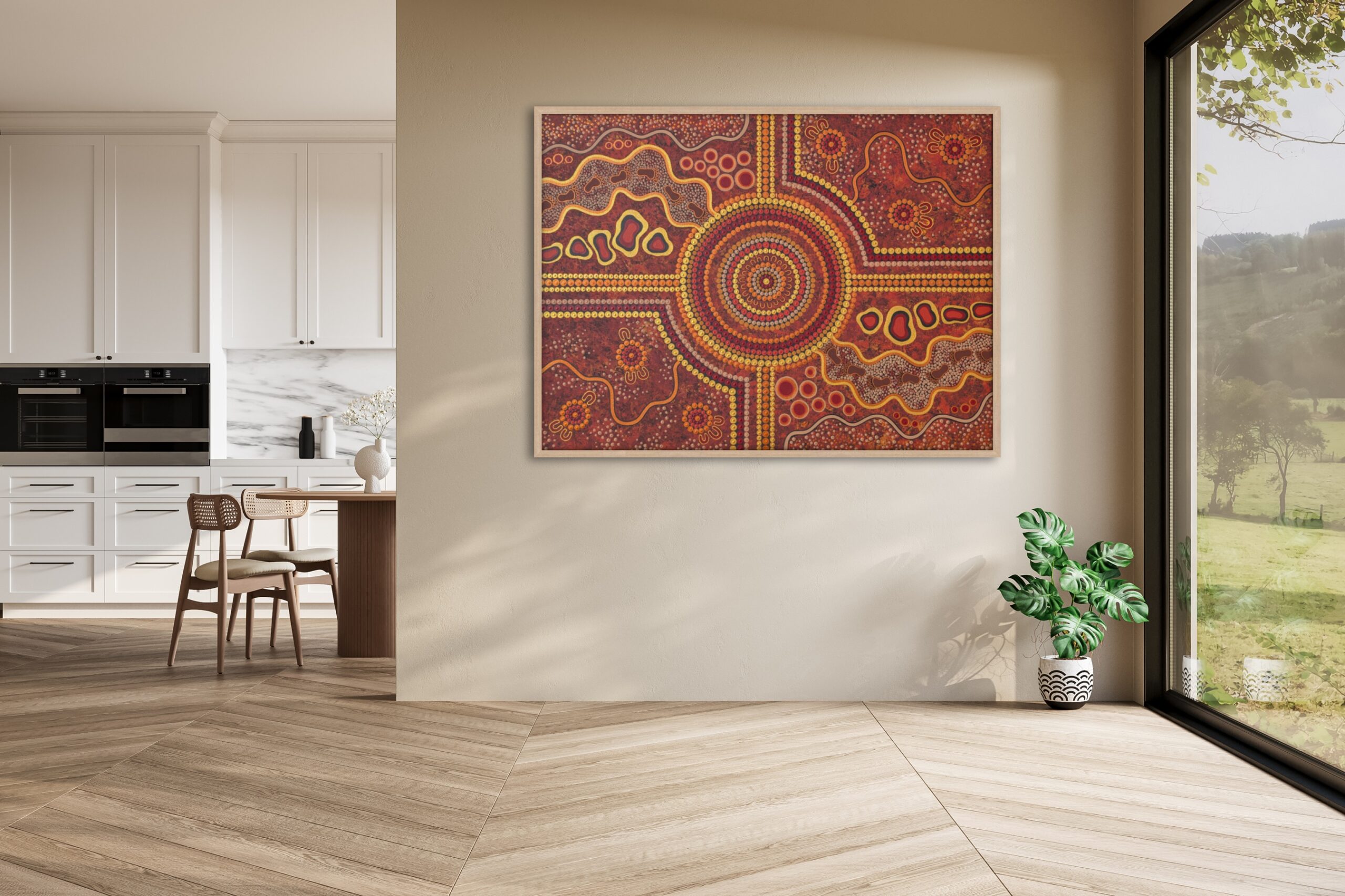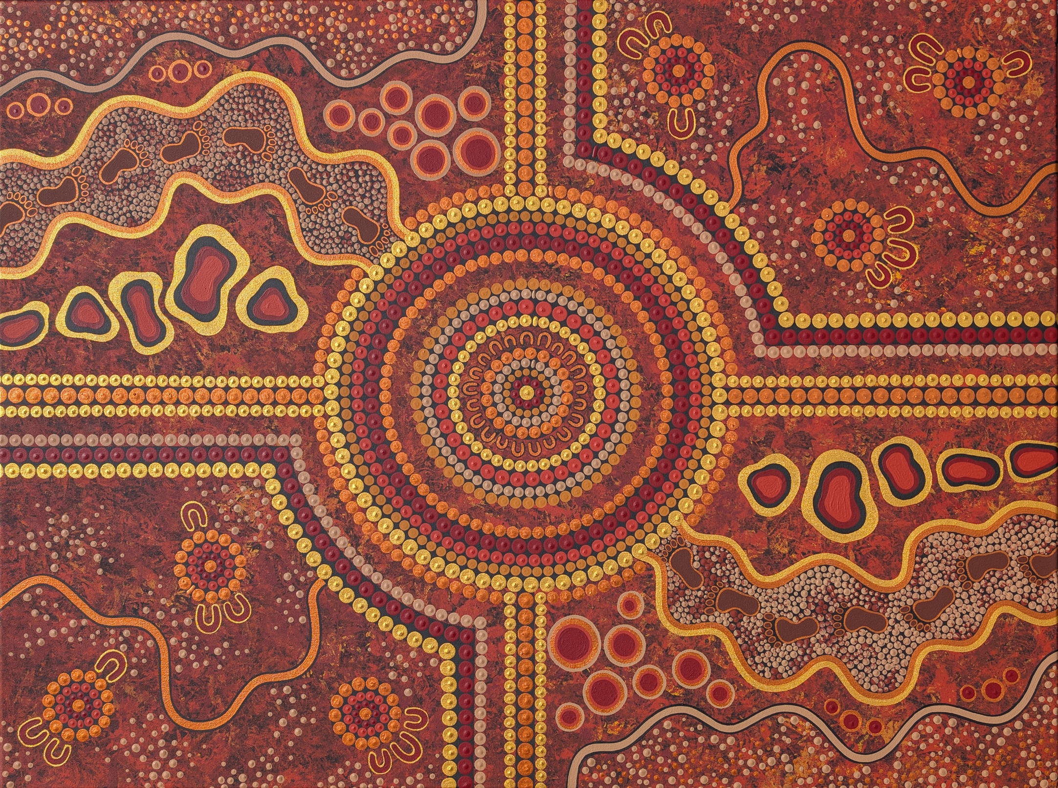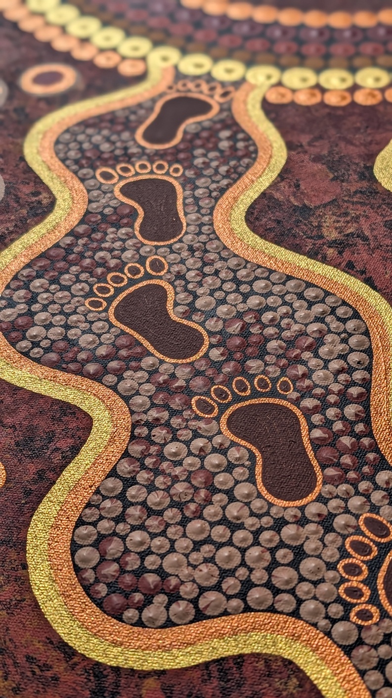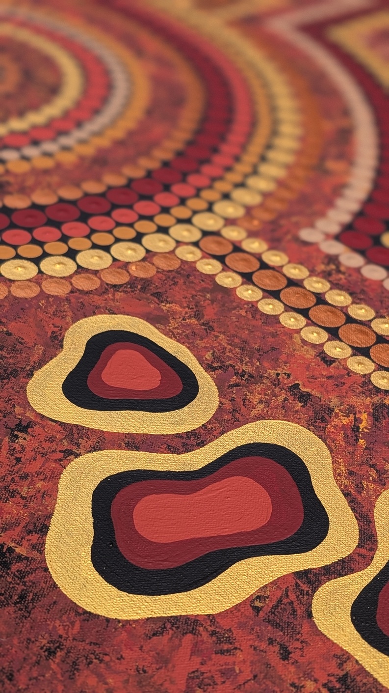 Journey lines flow across the surface like breath, connecting past to present to future. Golds and ochres glow with warmth and the guidance of our ancestors, woody tones blend with the oak frame, holding the artwork like Country holds its stories.