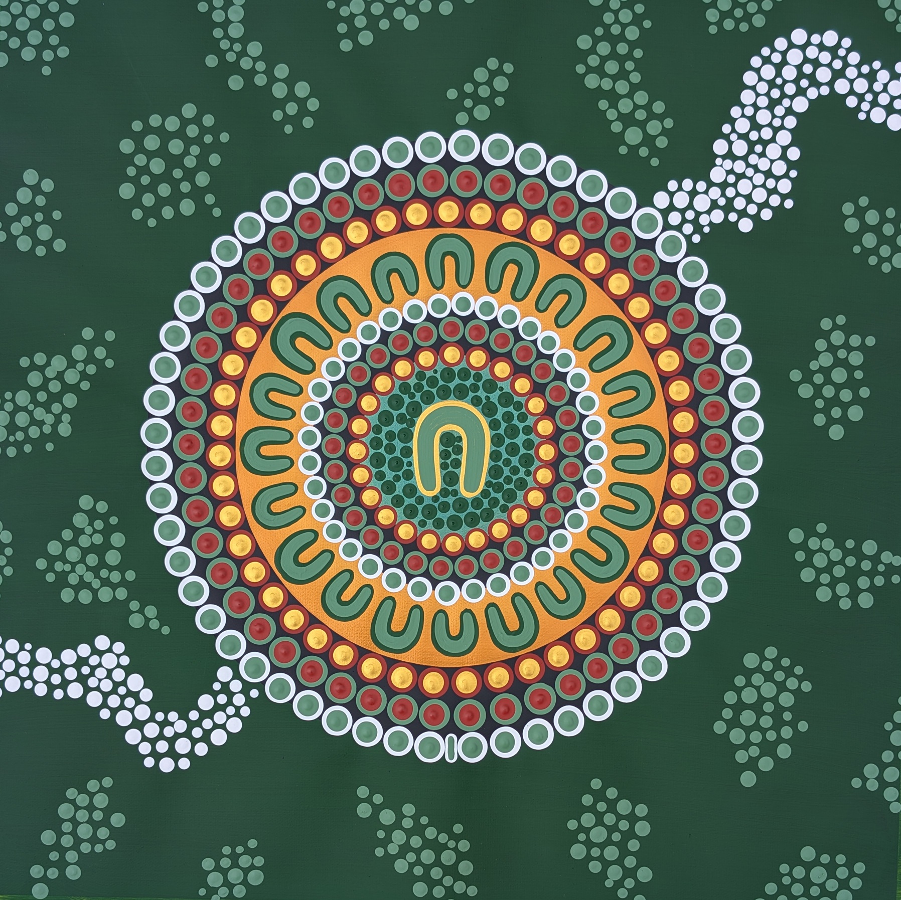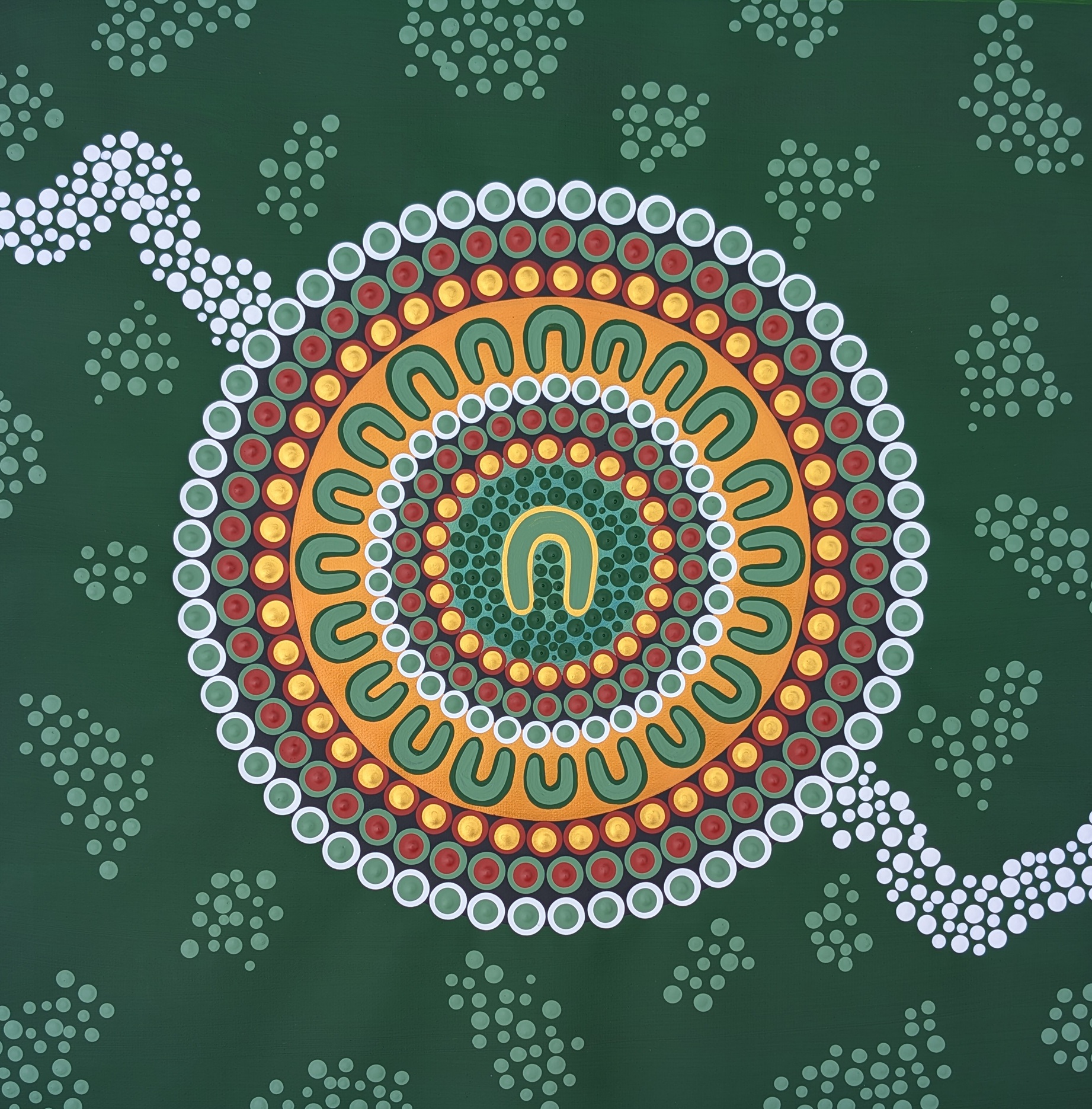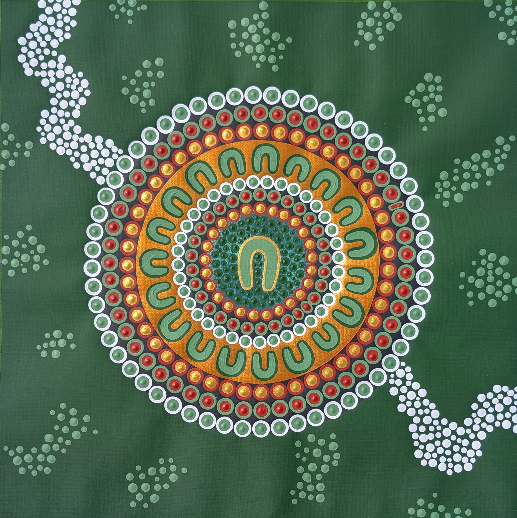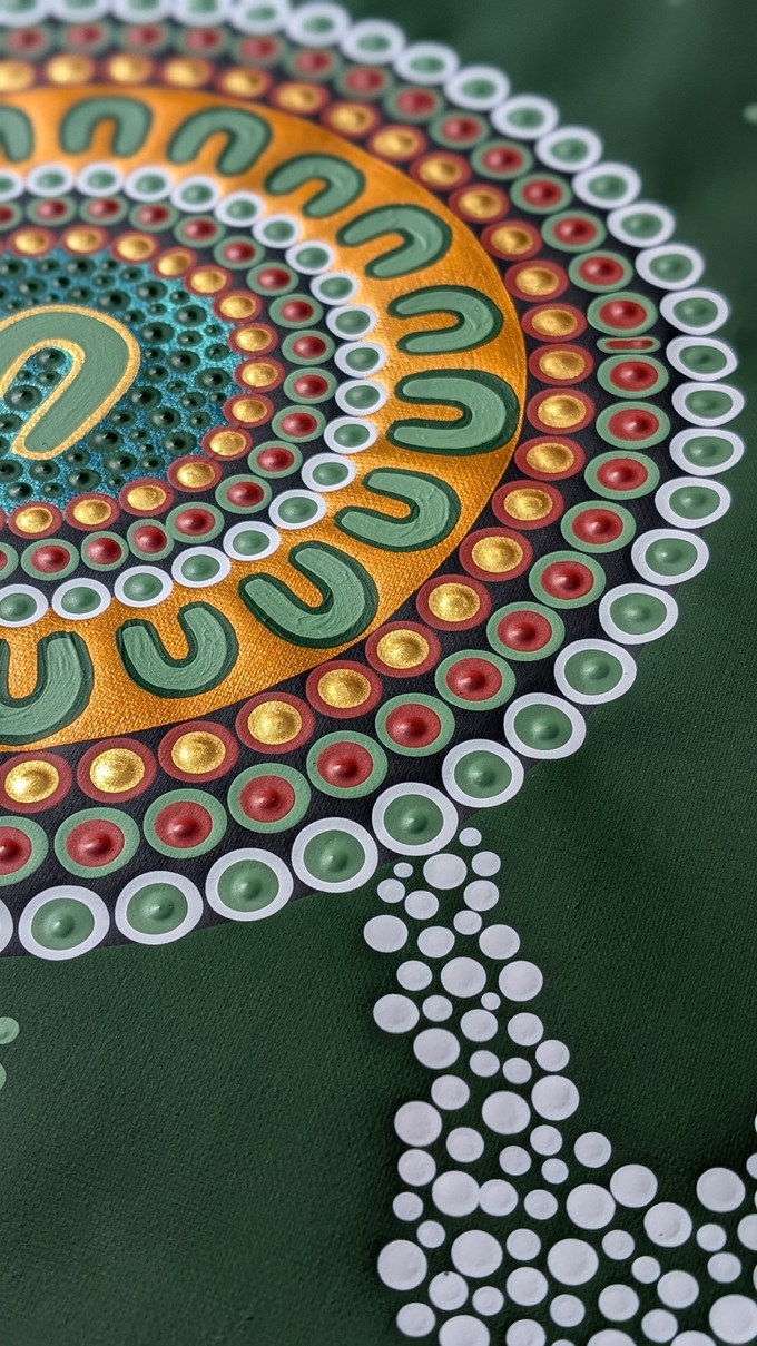 The surrounding symbols represent her family, connected through her love, values and guidance. Though each artwork is a recreated original, they carry their own unique spirit and energy and are intended to live in six different homes, reflecting how her legacy continues equally through each child and grandchild.