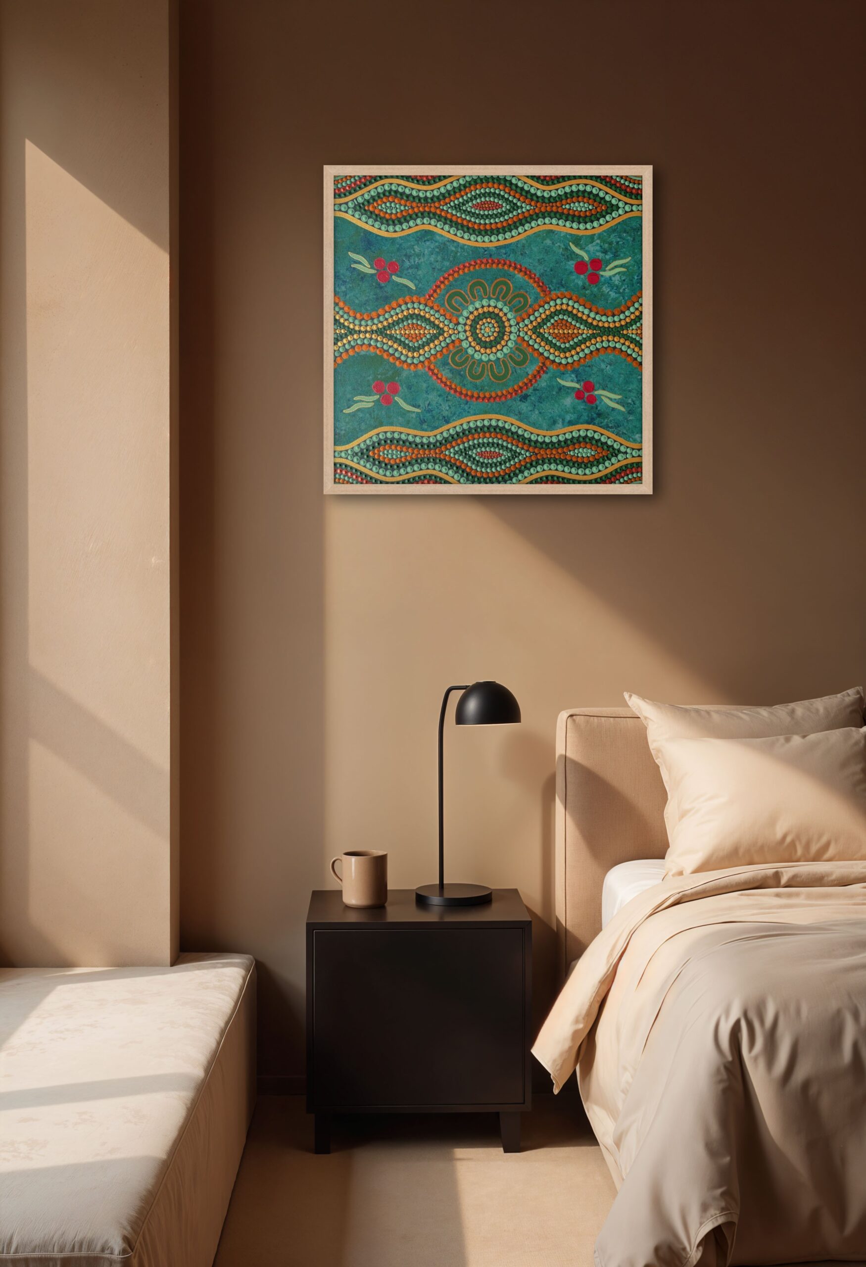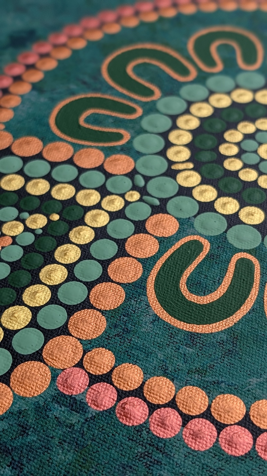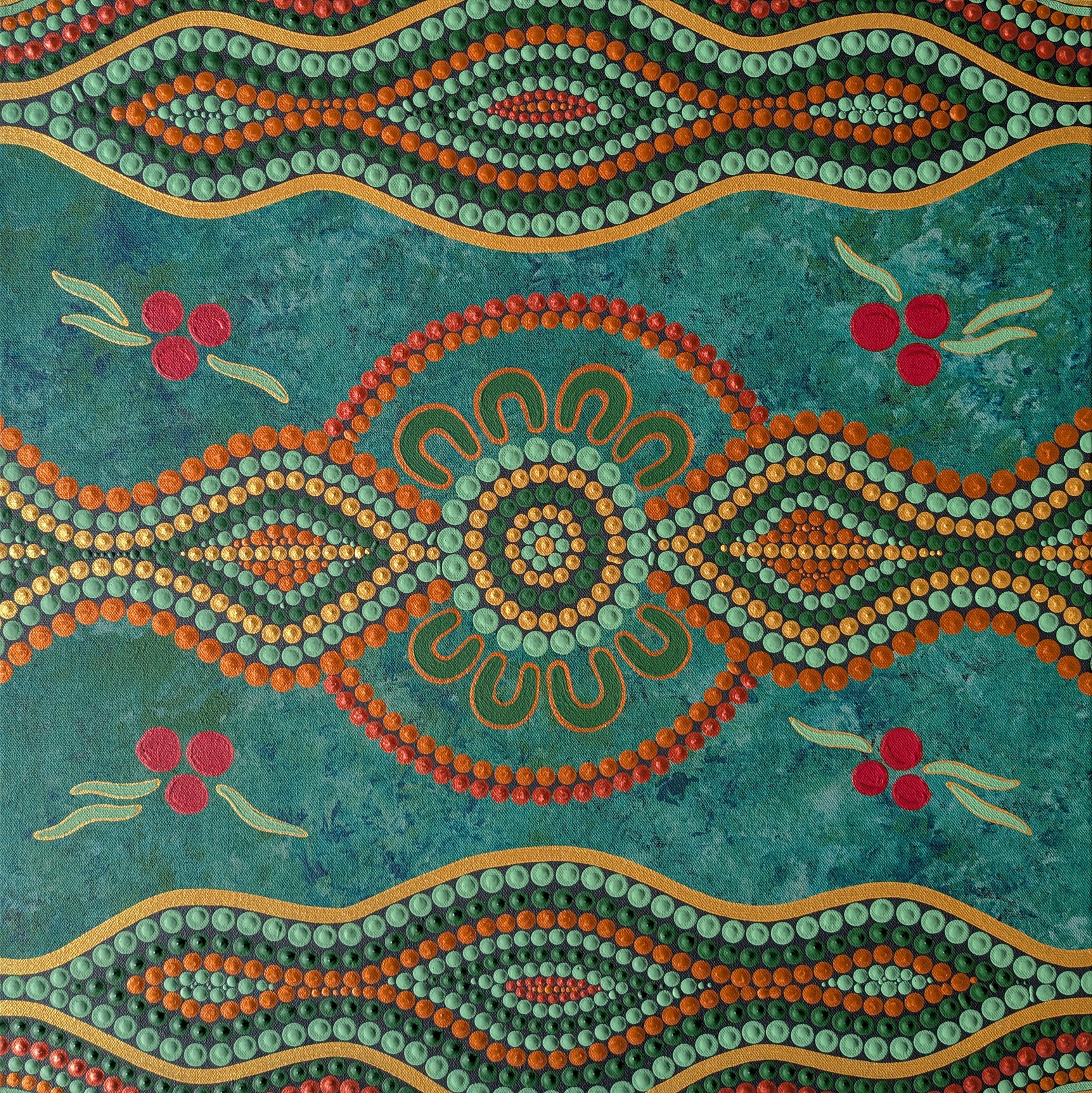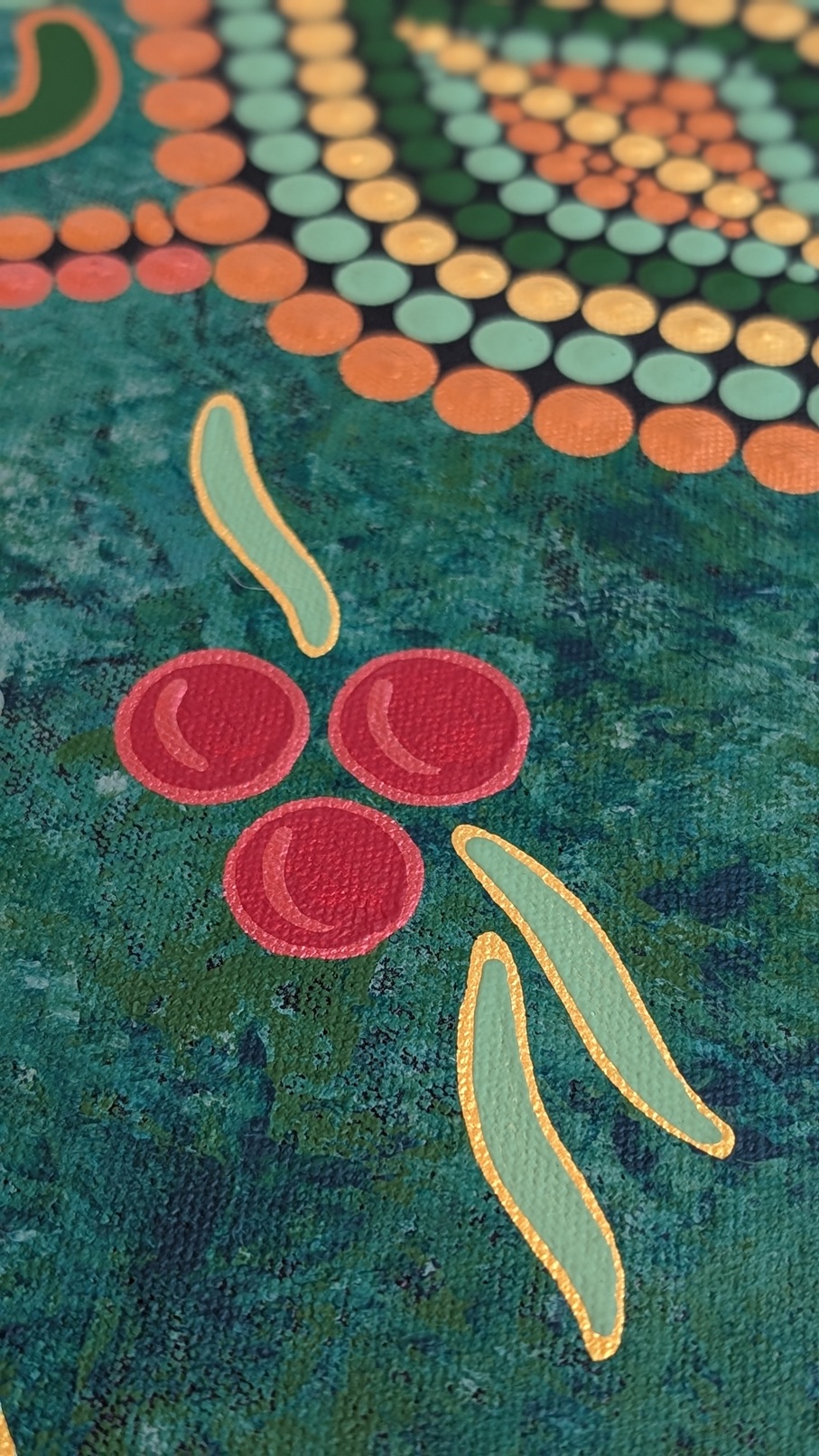 Bright red berries represent Quandongs alongside golden medicine leaves representing good health and spirit. Rippling metallic dot work symbolises family, tradition and the passing down of knowledge while natural greens and ochres symbolise healthy Country.