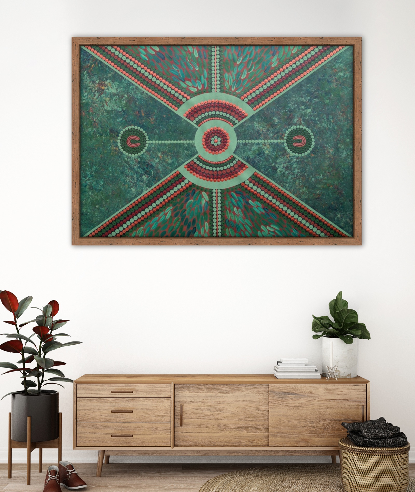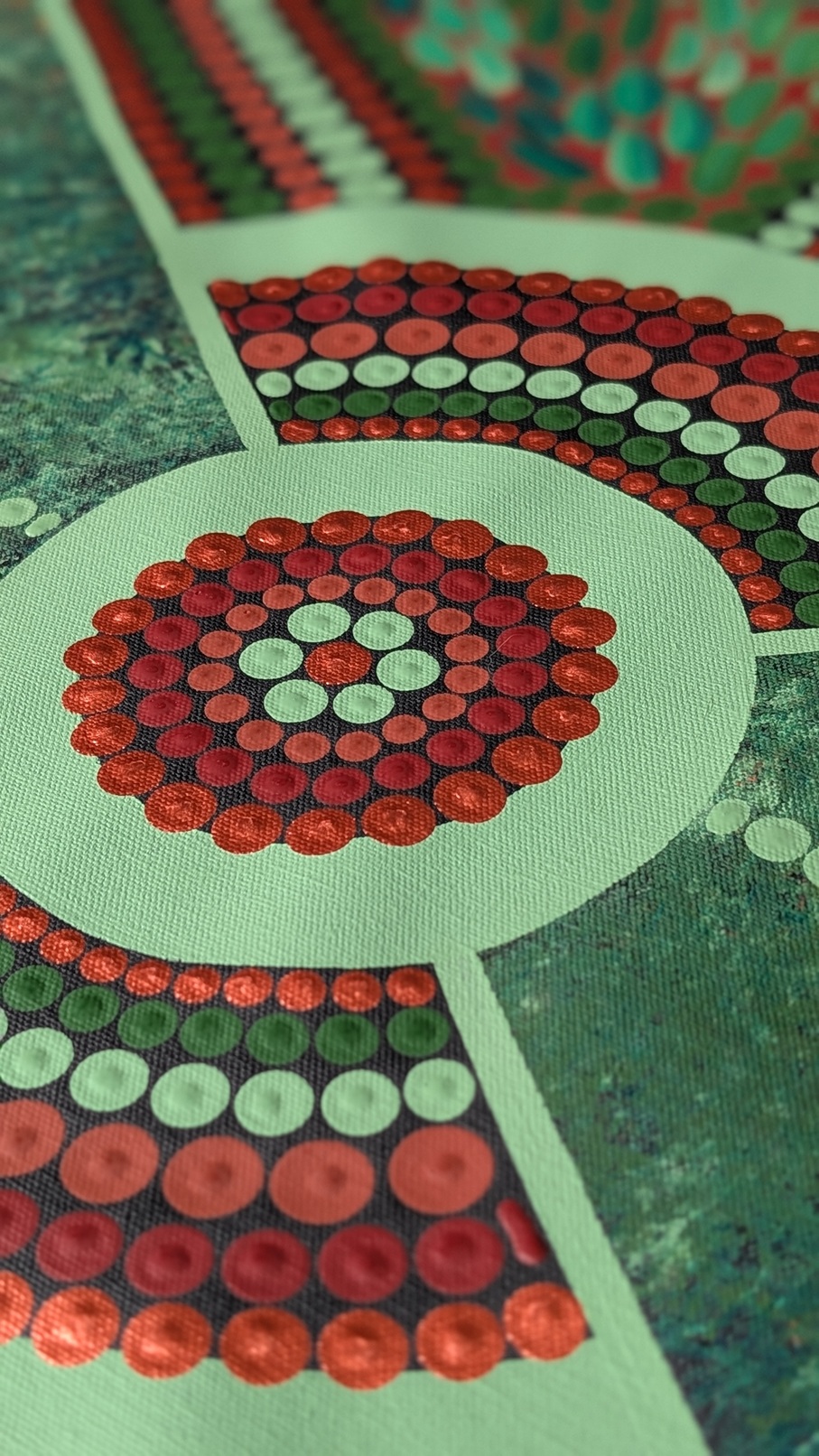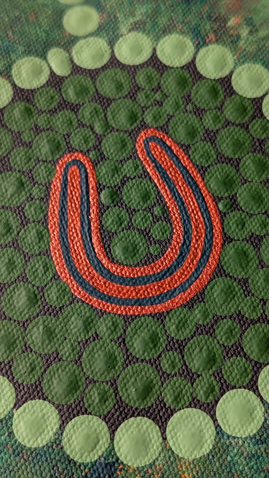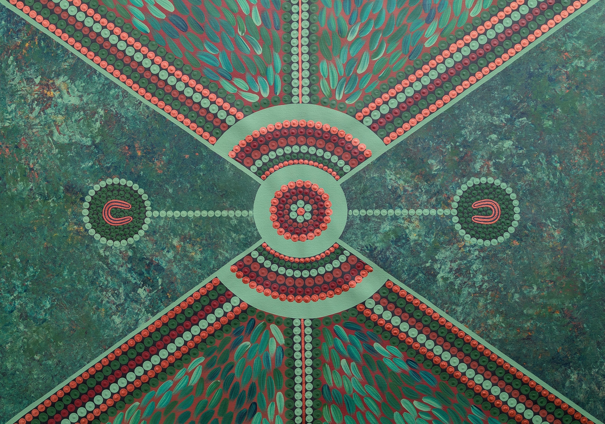 Medicine leaves flow through the piece as symbols of blessing, healing and strength, while the shining bronzes, earthy ochres and deep greens represent family, faith and community.