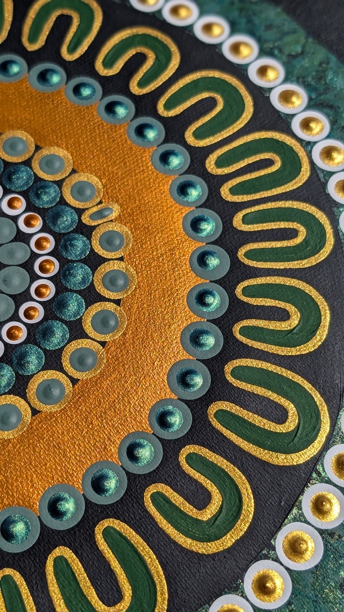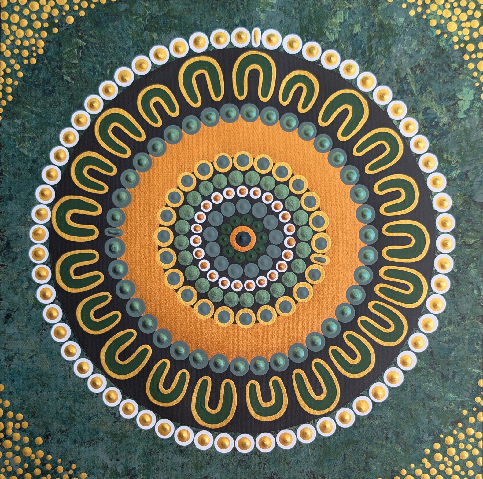 Deep greens represent lush Australian bushland, while white and gold dot work reflect our ancestors ever-present guidance and protection.