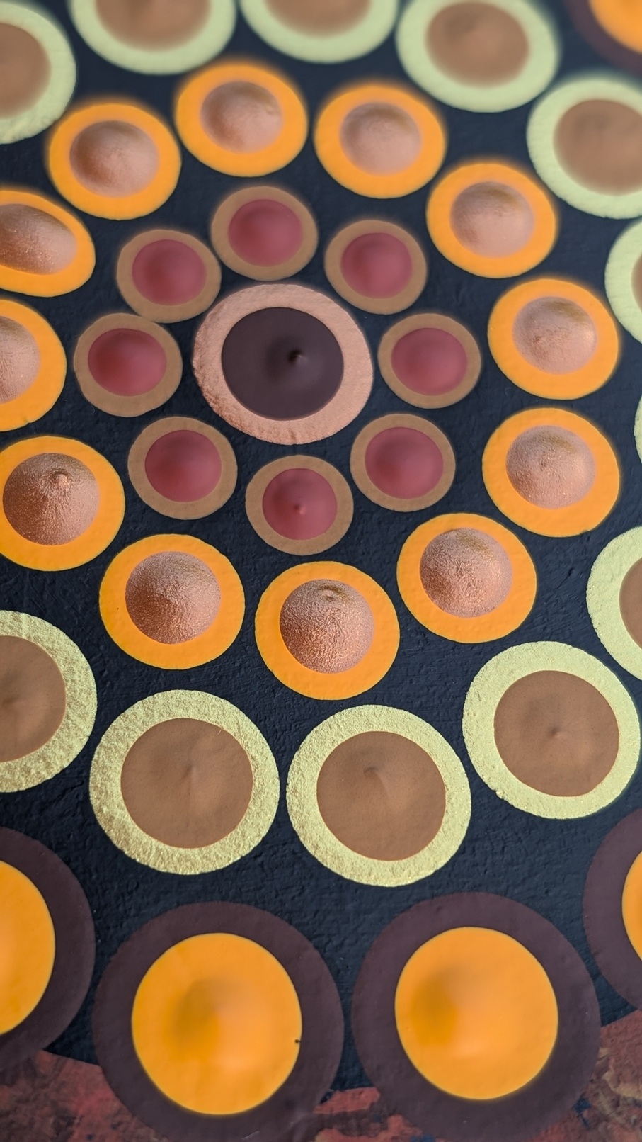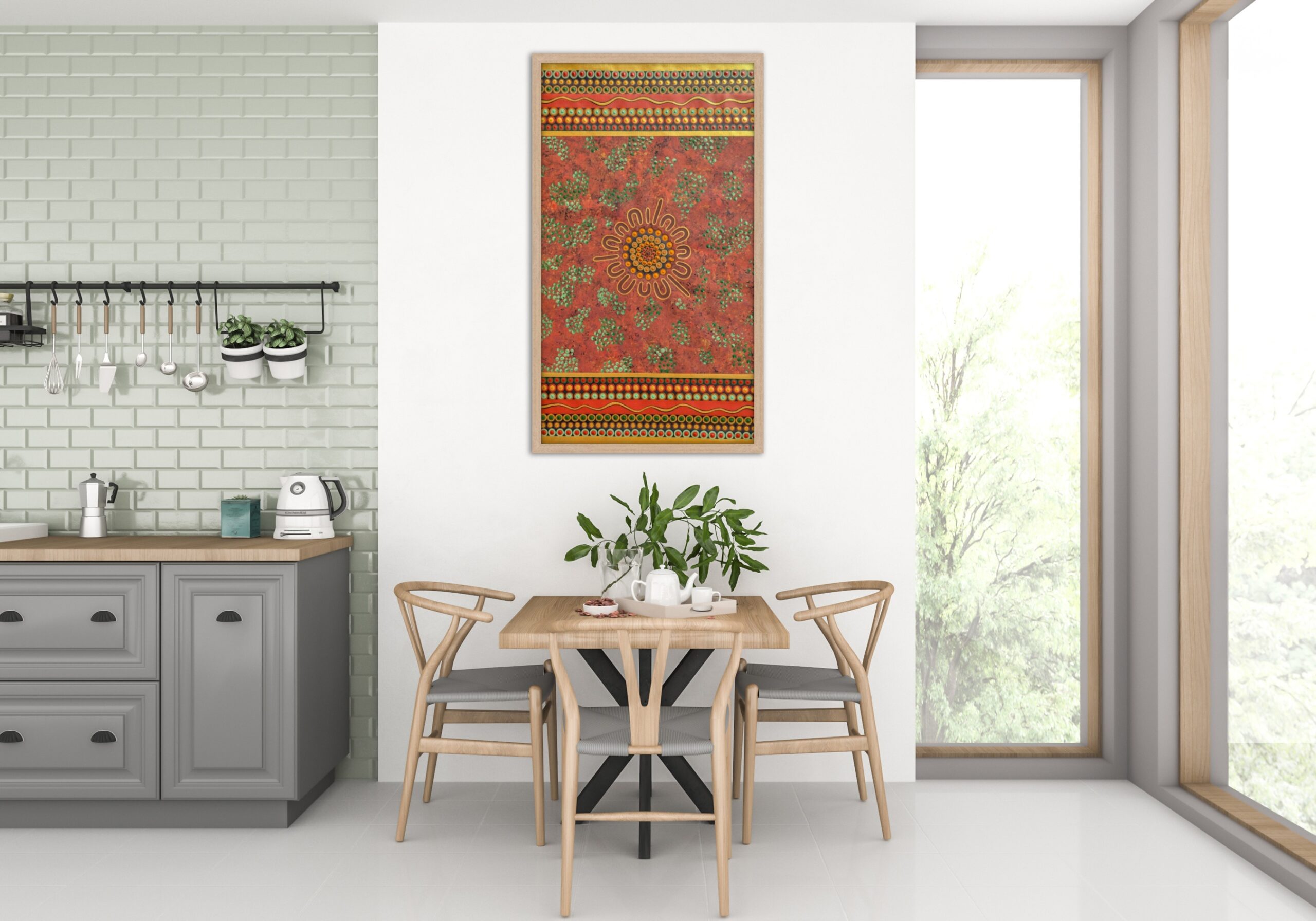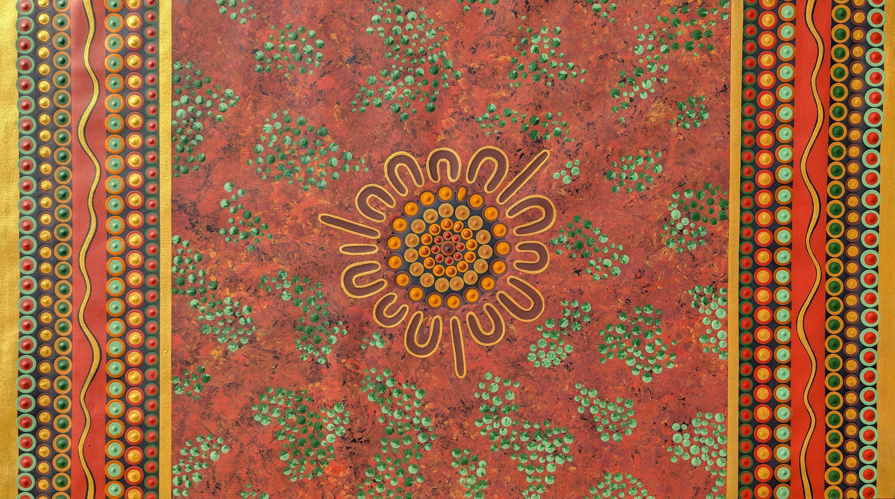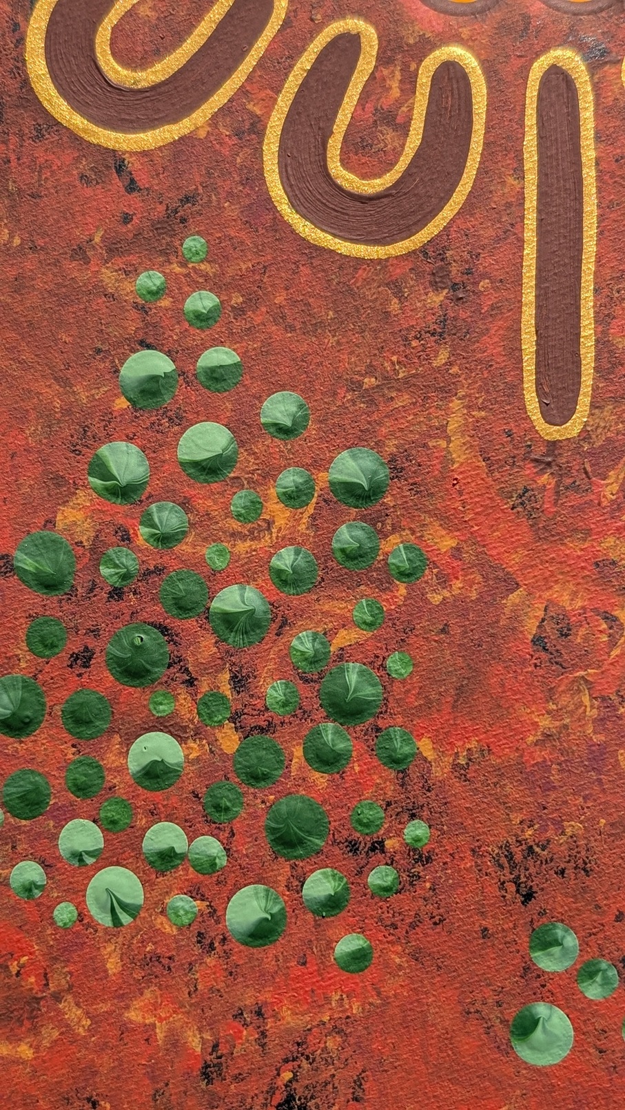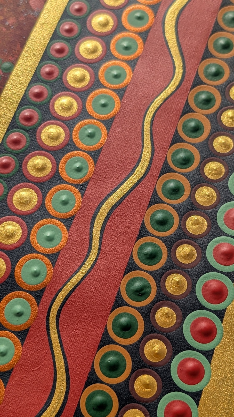 Blended green dot work reflect the bush in the summer heat, red earth shows the warmth of the ground and golds are our ancestors watching over us.